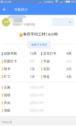 3、點擊考勤打卡就可以打卡了,還會顯示打卡的時間,還有多久遲到