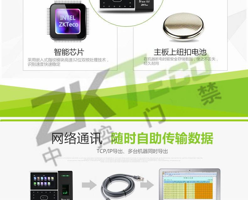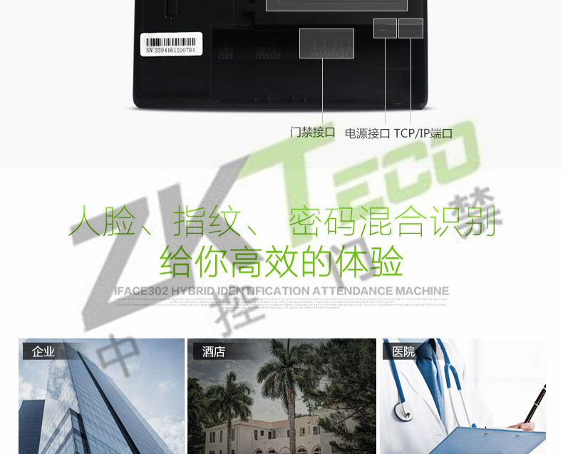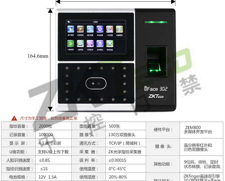 該產品采用了中控科技最新的ZEM600核心板,ZKFinger10.0指紋面部混合識別算法,容量大,識別速度快,集成高分辨率夜視紅外和彩色雙攝像頭功能,適用范圍廣,不受外界光線的影響,無論是在強光下還是在黑暗中也能進行有效識別。該系列已經通過了超過10萬面部數據庫長達2年的測試,同時該算法也在美國San Jose大學年度測試中名列前矛,在用戶舒適度方面獲得了最佳評分。iFace采用了嵌入式中控Multi-Bio CPU,主頻為630MHZ,可以處理高達1:20000的1:N速度,符合人體工程學的外觀設計,工業設計由德國專業公司主導完成,模具采用了PC材料+蝕紋工藝+鏡面工藝,采集比對就如照鏡子一般,支持4.3寸全觸摸TFT,僅有6個狀態功能鍵,其它按鍵在TFT上全觸摸操作。標配TCP/IP通訊方式,支持跨網段跨網關連接。