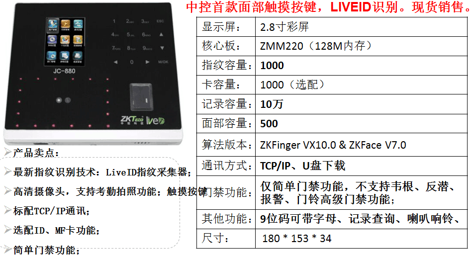 面部識別考勤機zk-jc880 磁吸式門禁系統(tǒng)