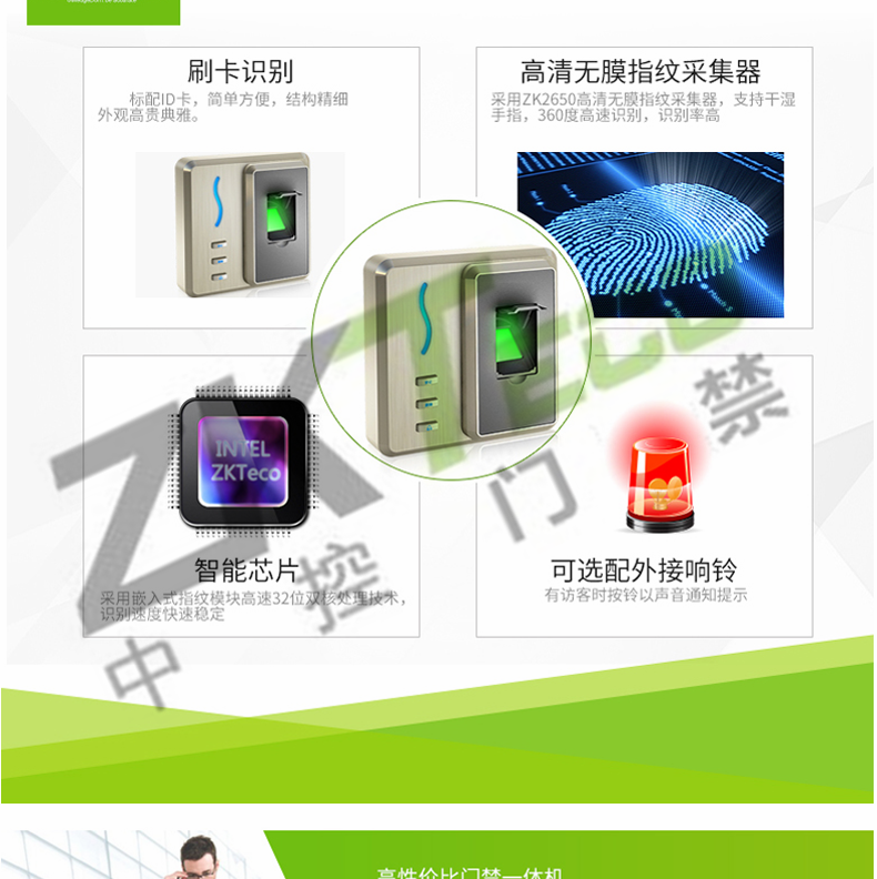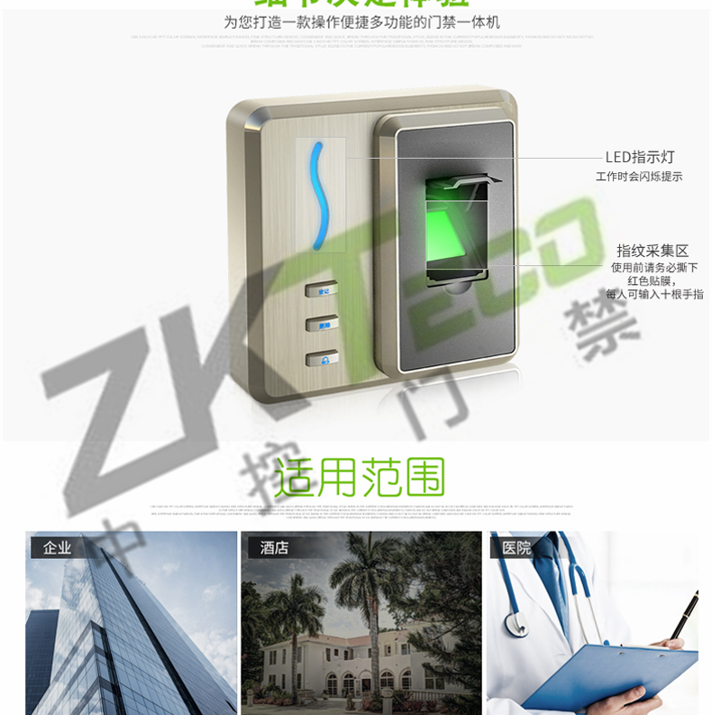 產品介紹:本產品是一種可直接控鎖,又可以連接控制器使用的指紋門禁一體機,該產品采用堅不可摧的鋅合金材料,表面采用珍珠烙處理工藝,高貴典雅的歐美設計風格。該產品采用大量可靠穩定的進口元器件,設計上嚴格遵循國家安全防范產品標準,出廠經過嚴格的老化測試。該產品只有登記、刪除和門鈴三個按鍵,操作的每一步都有語音提示,使得客戶操作更加簡單方便,無LCD設計和指紋儀防塵翻蓋起到了很好的防塵作用,保證整個產品清潔,USB-Client通訊方式大大減少了布線的繁瑣,標配ID卡模塊,為客戶使用提供更大的選擇空間,適合于小型辦公環境、企業內部和一些安全級別要求較低的出入場所。