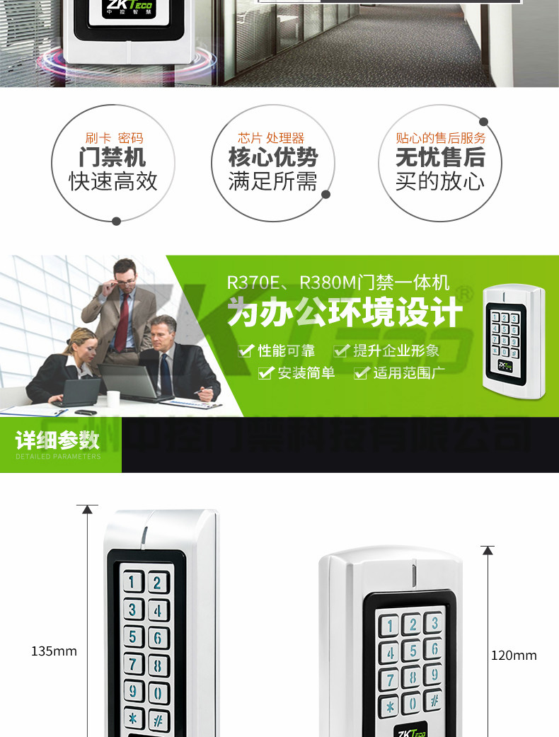 金屬刷卡門禁一體機R370/R380支持支持常規非接觸式ID卡、IC卡,二代證以及HID iclasss卡等,是目前比較先進的單門門禁控制器之一。采用獨特的金屬外殼設計,靈巧的鍵盤面板操作,內置高檔微處理器,抗干擾能力強,安全性和可靠性極高,可為1000個用戶提供強大的安全保障。具有超低功耗、夜光鍵盤、獨立密碼、韋根輸出、輸出短路保護、門磁報警、防拆報警、開門按鈕、門鈴接口、安全級別設置等強大功能,使用非常方便,可廣泛應用于家庭、辦公室、住宅等。