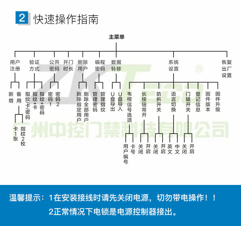 1、初始編程密碼為:9999。 2、編程狀態: 按 * 編程密碼 # 進入編程狀態。按 * 可退出編程狀態 ,或者無任何操作十秒鐘后自動退出。 3、按鍵說明: 【*】按鍵為進入或退出編程模式 【#】按鍵為確認鍵或門鈴按鈕 【2】、【8】按鍵進入多級菜單后為上翻與下翻鍵 4、使用方法: (1)正常工作狀態按用戶指紋、讀用戶卡或輸入正確的開門密碼即可開門。 (2)如果忘記編程密碼了,可以把門禁機拆下來恢復編程密碼。 (注:如要刪除全部用戶信息,需進入主菜單,進行“恢復出廠設置”)