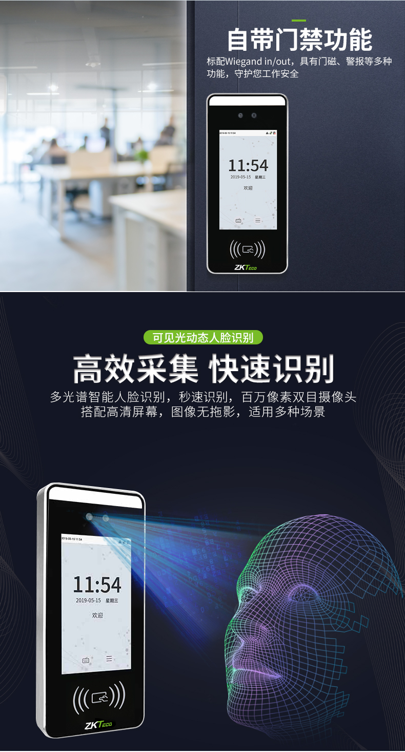 中控xface60非接觸式刷卡門(mén)禁是中控智慧根據(jù)市場(chǎng)需求,全新推出的多光譜智能考勤機(jī),區(qū)別于以往的人臉靜態(tài)識(shí)別,具有快速讀取、動(dòng)態(tài)識(shí)別的功能。xFace60采用Linux操作系統(tǒng),具有刷卡認(rèn)證、人臉識(shí)別等驗(yàn)證方式,簽到多種選擇,輕松考勤;中英文輸入法,輕松編寫(xiě)。標(biāo)配Wiegand in/out,具有門(mén)磁、報(bào)警等多種功能,守護(hù)您工作安全。