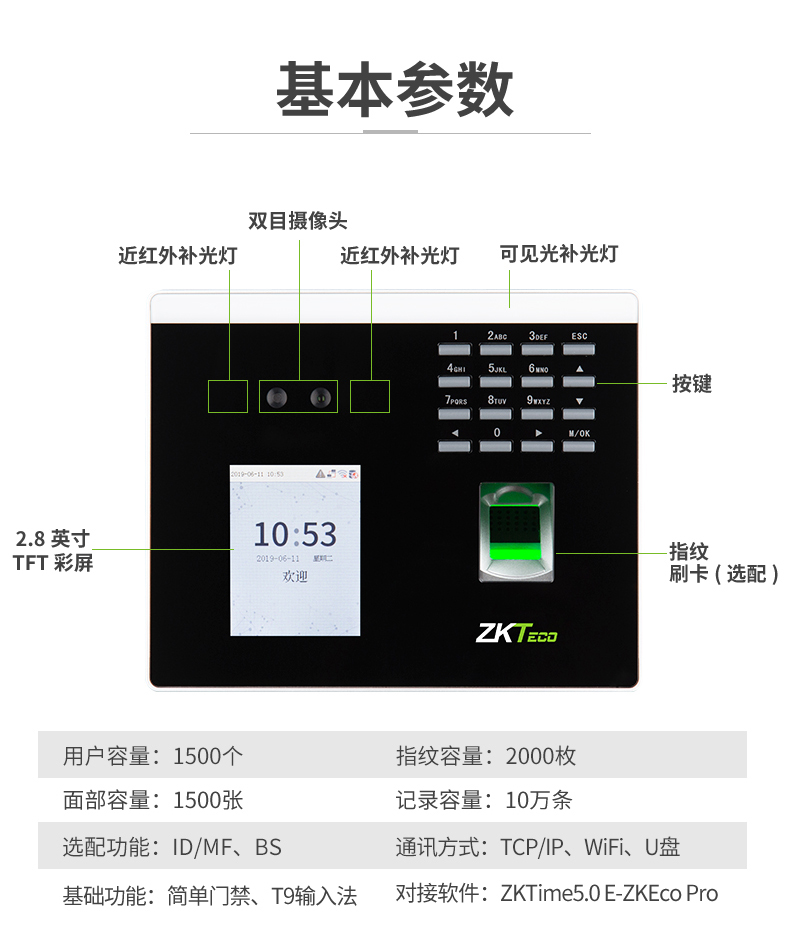 中控xface100 wifi無線人臉識別門禁是廣州中控全新推出的一款多光譜智能指紋面部考勤機,采用Linux操作系統(tǒng),運用高性能人臉識別算法,0.5秒內(nèi)快速識別。配置200萬高清雙目攝像頭,實現(xiàn)精準(zhǔn)人員身份驗證。兼具門磁、報警、開鎖、出門開關(guān)等門禁管理功能,滿足大眾化需求,守護(hù)辦公環(huán)境安全,適用于酒店考勤、社區(qū)門禁等場景需求。此外,根據(jù)需求可進(jìn)行精細(xì)化管理平臺定制,實現(xiàn)時間和安全的高效。 用戶容量1500個指紋容量2000枚面部容量1500張記錄容量10萬條顯示屏2.8寸彩屏通訊方式TCP/IP、WIFI基礎(chǔ)功能U盤功能、攝像頭、T9輸入法、記錄查詢使用溫度0℃~45℃使用濕度20%RH~80%RH電源規(guī)格DC12V/1.5A尺寸138*170*32.3mm